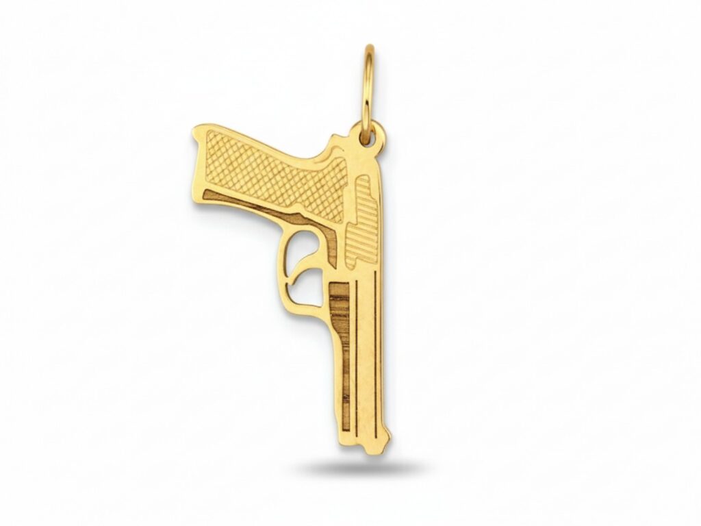 Przedmiotem sprzedaży jest złota zawieszka Pistolet, wykonana z próby złota 585. Produkt pochodzi prosto od producenta, jest nowy wraz z metką jubilerska. Powierzchnia pięknie odbija światło, sprawiając niesamowite wrażenie, produkt wykonany w całości z żółtego złota.