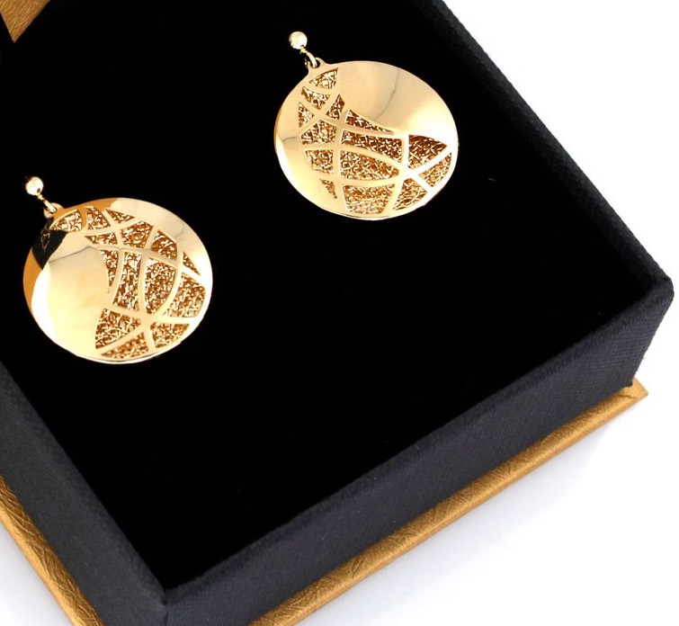 Przedmiotem sprzedaży są złote kolczyki wiszące okrągłe trójwymiarowe próby 585 zapinane na sztyfcie. Produkt pochodzi prosto od producenta, jest nowy wraz z metką jubilerska.